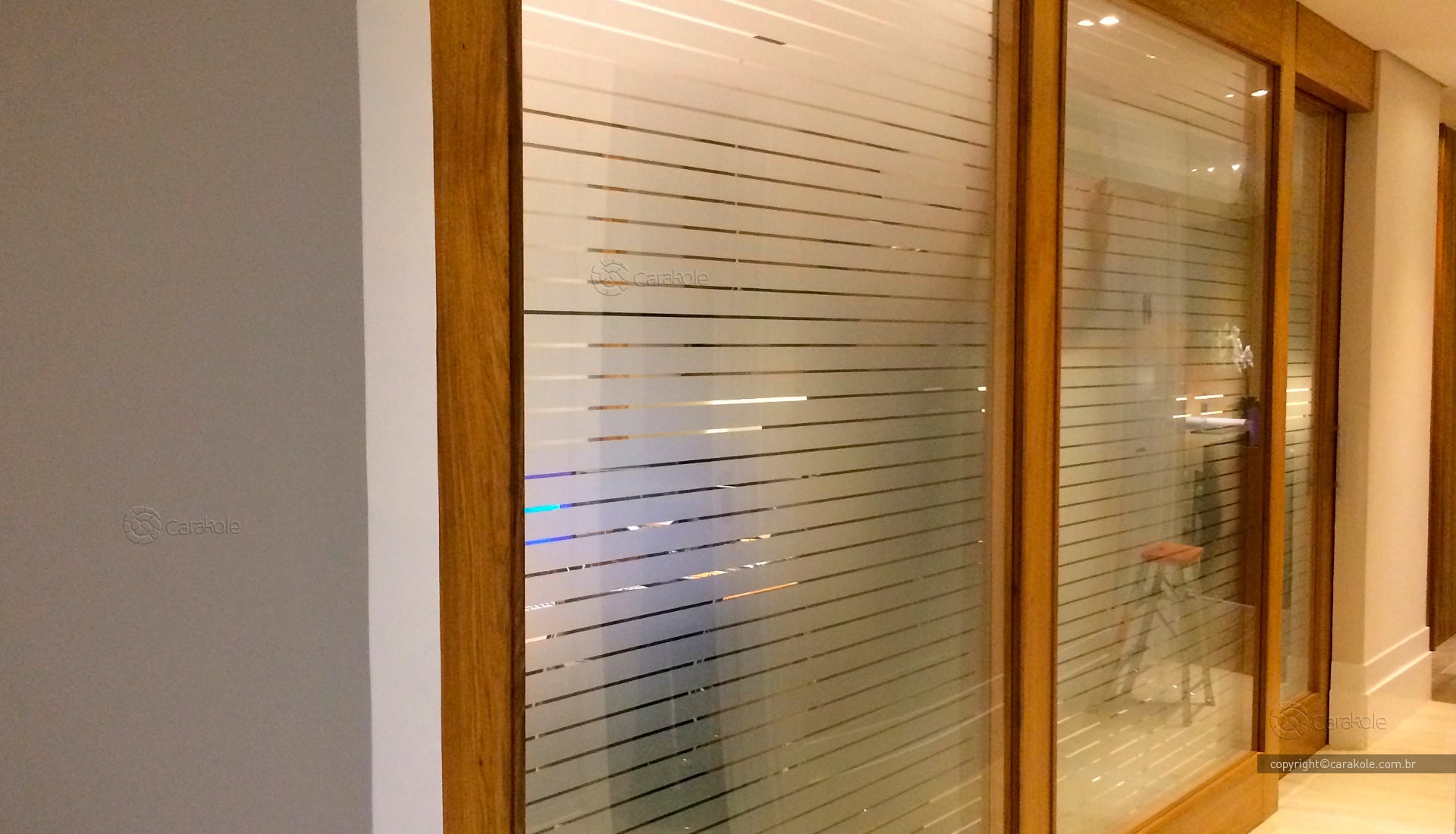 Para uma privacidade total ou para valorizar a estética do espaço, alguns clientes optam em fechar totalmente o vidro com o adesivo jateado. Desta forma não se perde a iluminação natural e suaviza a visualização do ambiente externo, além de transmitir um conforto e bem estar.
